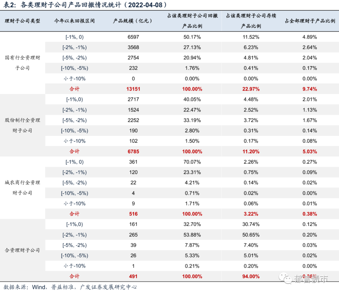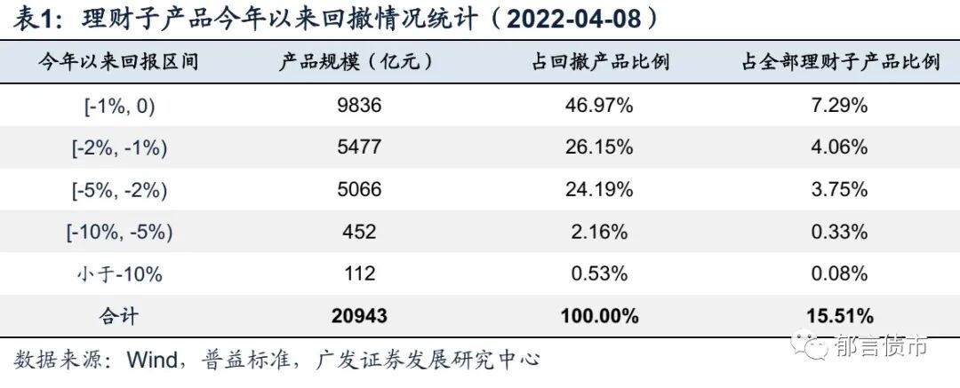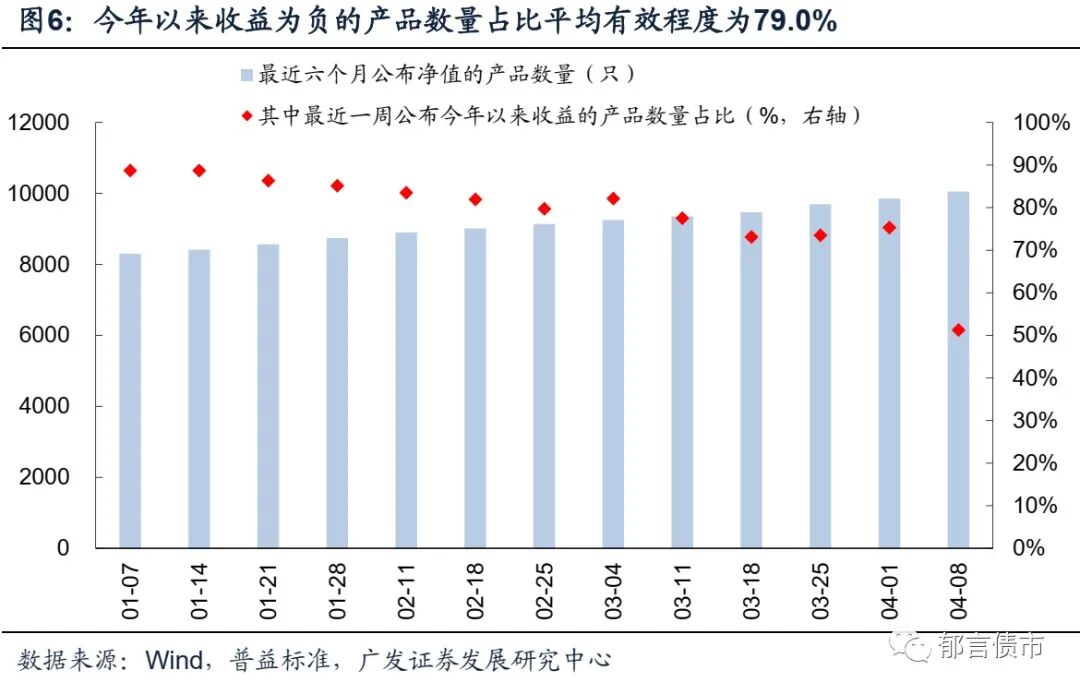 需要说明的是,我们在统计今年以来收益为负的产品数量占比时,均采用过去一周披露过净值数据的理财产品作为分母,并将其中今年以来收益为负的产品数目作为分子;对于4月1日和4月8日的数据,由于过去一周披露过净值数据的理财产品占比较低,我们对过去两周披露过净值数据的理财产品进行统计。