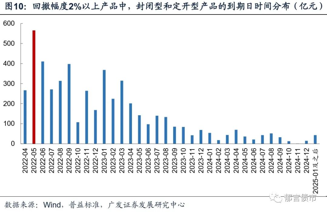 其中,对于今年以来回撤幅度在2%以上的理财产品,2022年5月到期规模较大,为565亿元。此外,2022年6月和9月到期规模分别为411、398亿元。