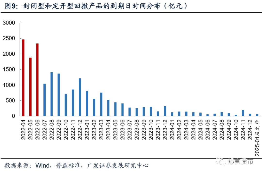 综合封闭型产品和定开型产品的下次开放时间来看,8月和9月是2022年内到期高峰。2022年5月到期产品规模为238亿元,较2022年4月增加44.7%;6-7月到期产品规模较小,单月均在110亿元以下;8-9月单月到期产品规模增加至250-400亿元,到期压力较大。而到期较为集中的时间分布在2023年1-2月,将迎来780亿元封闭型和定开型产品开放。