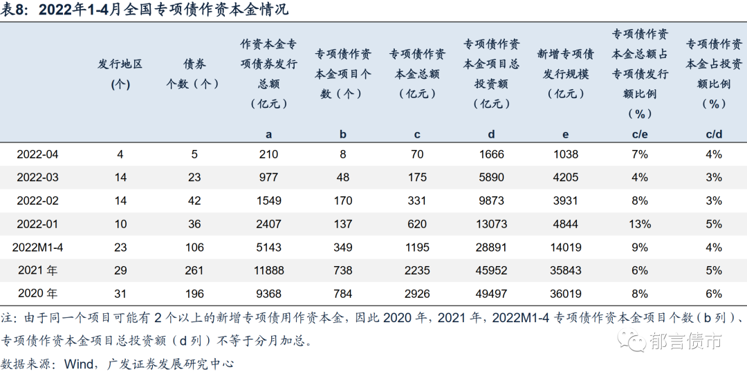 从专项债作资本金情况来看,2022年4月,专项债作资本金总额占专项债发行额比例约为7%。全国共落地作资本金的专项债券5只,专项债作资本金总额70亿元,占新增专项债发行规模1038亿元的7%。从项目层面来看,2022年4月专项债作资本金的项目8个,涉及项目的总投资额达1666亿元。
