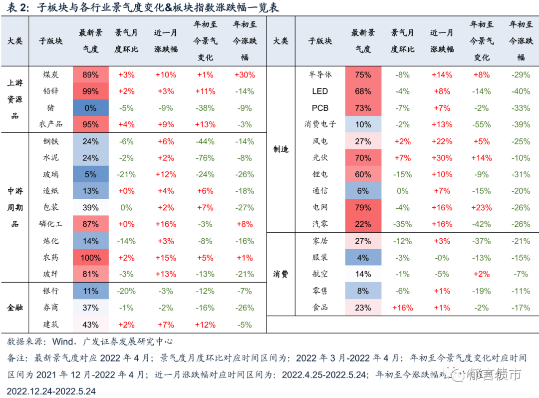 从年初以来走势来看,虽然没有明显的景气行业大幅跑赢的情况(这点与2021年不同),但也呈现出景气行业在同类行业中表现更强的特征,如包括煤炭、农产品、农药等高景气品种在周期品中股价表现偏强,而景气持续向上的光伏在成长性更好的制造消费类行业中表现偏强。