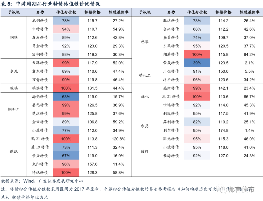 我们还整理了五大板块33个行业的最新转债估值性价比情况。上游资源品行业中,拟合估值分位数相对较低的个券包括靖远转债、中金转债、国城转债、牧原转债、温氏转债、希望转2等,可结合正股情况适当关注。
