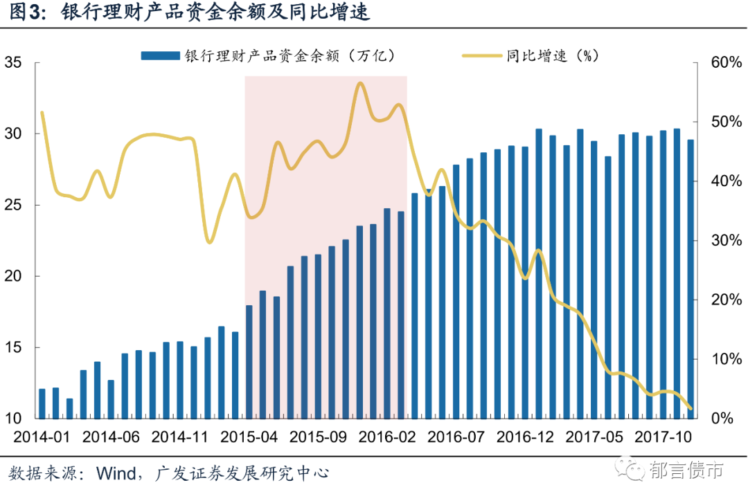 第二,股市大幅下跌,金融机构加杠杆,银行委外大潮,对债券需求量激增。沪深300指数和创业板指数均在2015年6月达到新高,随后触顶大幅下跌,资金从股市撤离。在宽松的货币政策和金融监管的背景下,商业银行理财规模快速扩张,银行理财产品资金余额从2015年初的15.67万亿增长至2016年末29.05万亿,两年增长85.39%,其中2015年增速达49.97%,约为2014年增速的2倍。