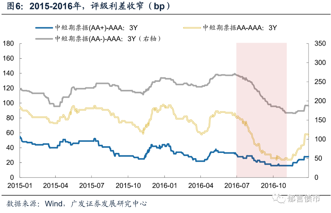 因此信用下沉成为了资产荒后期的主流策略,隐含评级AA、AA-与AAA的利差从2016年6月中旬开始明显压缩,这一利差压缩过程一直持续到10月下旬。其中隐含评级AA-与AAA的利差在2015年6月中旬至2016年6月中旬一年的时间里走扩了35bp左右,而之后的4个月时间里,利差压缩了近100bp。