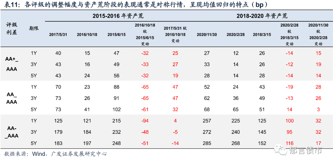 第三,资产荒结束之后的调整阶段,各评级、各期限的调整幅度与资产荒阶段的表现通常是对称行情,呈现均值回归的特点。2015-2016年资产荒阶段,机构采取比较极致的拉久期和信用下沉策略,评级利差和期限利差大幅收窄,即低评级、中长久期表现最优,在调整阶段,收益率上行幅度从高至低依次是AA>AA+>AAA,3年期和5年期的收益率上行幅度也大于1年期。