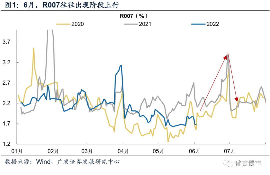 6月流动性往往出现短暂的季节性收敛。观察近几年流动性情况,可以发现,进入6月,R007、1个月期限同业存单利率等往往出现季节性上行。背后的原因可能在于跨半年MPA考核前夕,银行削减资金融出规模、同时对跨半年的同业存单需求有所增加。在跨半年之后,银行融出恢复,资金利率相应回落。![]()