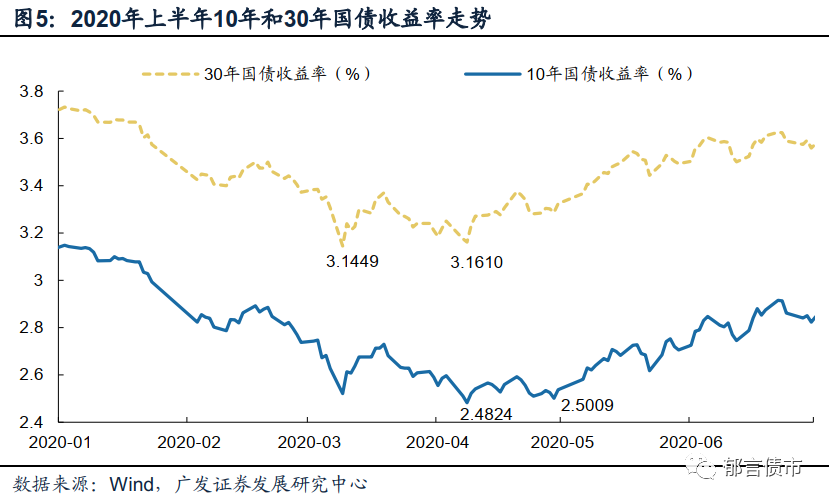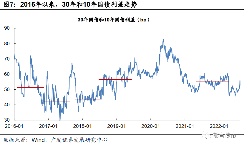 30年国债收益率下行的空间,可以从期限利差的角度出发,2020年30年和10年国债利差处于较高水平,主要是受到超长期限地方债发行放量的影响。2016年30年和10年国债期限利差的波动区间,对当前具有一定程度的参考意义。当前30年和10年国债期限利差为53bp,介于2016年8-10月43-59bp的偏中间位置,后续30年和10年国债期限利差可能还有10bp的压缩空间。