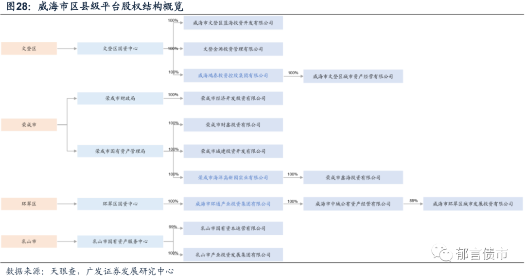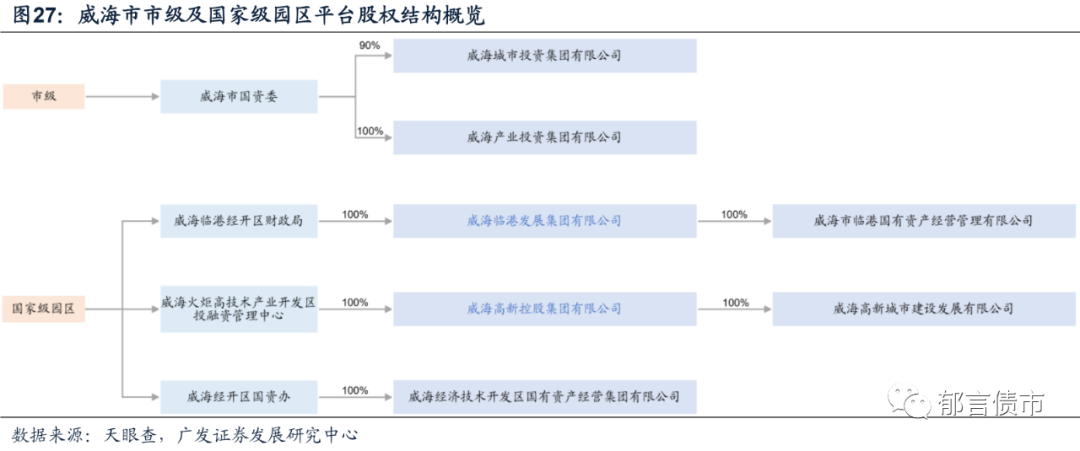 威海市位于山东半岛东端,是山东半岛的区域中心城市,重要的海洋产业基地和滨海旅游城市,下辖环翠区和文登区2个区、荣成市和乳山市2个县级市。产业结构方面,威海市三次产业比重由2020年的10.0:38.5:51.5调整为2021年的10.1:39.1:50.8,二次产业占比微升,逐步形成了医疗健康、纺织服装、办公自动化设备、渔具等特色优势产业。2021年全市规模以上工业增加值同比增长12.1%,其中专用设备制造业增长27.3%,计算机、通信和其他电子设备制造业增长22.7%。大中型工业企业增加值增长11.9%。土地方面,威海市2022年1-7月土地推出宗数由2021年同期的298宗降至265宗,同比下降11.1%,推出建面1320万方,同比下降6.1%,土地出让金107亿元,同比下滑12.2%。平台概况方面,威海市共有17家平台,其中市级平台2家,区县级平台11家,国家级园区平台3家,其他园区平台1家。2家市级平台分别为威海产业投资集团有限公司(“威海产投”)、威海城市投资集团有限公司(“威海城投”)。威海产投是威海市重要的产业投资与资本运营主体。2019年7月,威海市国资委下发《关于优化调整威海市国有资本运营有限公司并更名为威海产业投资集团有限公司的通知》,公司剥离低效无效及不良资产,无偿划入优质资产,主业结构逐步调整,主要涉及公用事业、贸易、金融服务和投资领域。截至2021年末,公司债务结构较为合理,以银行贷款为主(61.1%),非标占比在10%以下。不过,公司有息债务中短期债务占比较高,为66.9%。目前,公司存续2只中票和1只私募公司债,存量规模合计35亿元,平均估值3.67%,平均剩余期限1.2年,存在一定性价比。威海城投是威海市重要的基础设施建设主体,主营业务包括委托代建、开发产品销售、海域使用权和管网租赁等。2021年,公司实现营业收入16.9亿元,其中城投类业务收入占比47.3%。截至2021年末,公司有息债务中债券偏高,为53.7%。目前,公司存量债规模为67.1亿元,债券平均估值较低,为2.72%,平均剩余期限2年。国家级园区层面,威海市3家国家级园区平台分别是威海经济技术开发区国有资产经营集团有限公司(“威海经开”)、威海高新城市建设发展有限公司(“威海高新”)和威海市临港国有资产经营管理有限公司(“威海临港国资”)。威海经开主要负责威海经开区的基础设施建设,营业收入主要来自代建业务和海域租赁,近3年代建业务占比均在70%以上。公司有息债务结构合理,截至2021年12月末,非标、债券和银行贷款分别占比7.1%、20.8%和72.1%。威海高新主要负责威海高技术开发区基础设施建设,收入也主要来源于基建和资产租赁业务。不过,公司资产租赁业务为主要收入来源,近3年收入占比在75%以上,租赁资产主要为高技区管委会注入的市政管网和海域使用权。相比之下,威海高新债务结构较差,2021年末有息债务中非标和债券分别占比24.9%、45.5%,均偏高。目前,威海经开和威海高新存量债规模分别为21.5亿元、33.2亿元,债券平均估值分别为3.48%、4.58%,平均剩余期限在1.2年左右。![]()