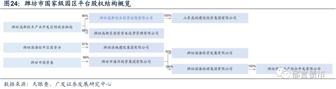 国家级园区层面,潍坊滨海经开区有3家国家级园区平台,分别为潍坊滨海投资发展有限公司(“潍坊滨投”)、潍坊渤海水产综合开发有限公司(“渤海水产”)和潍坊滨城建设集团有限公司(“潍坊滨城建设”)。潍坊高新区有2家,分别为山东高创建设投资集团有限公司(“高创建投”)和潍坊高新区国有资本运营管理有限公司(“潍坊高新国资”)。其中,潍坊滨投和高创建投有存量公募债且资产规模在500亿元以上。潍坊滨投主要负责滨海经开区的土地开发整理和基础设施建设,并且开展了贸易和房地产开发等市场化经营业务。2021年公司实现营业收入67.0亿元,其中城投类业务收入占比83.5%,城投属性较强。截至2021年末,公司有息债务中非标占比24.2%,债券占比50.0%,并且短期债务占比较高,为43.5%,债务结构较不合理。公司受限资产占净资产比例处于偏高水平,为75.3%,主要为用于抵押的土地使用权。高创建投主要负责潍坊高新区内的旧村改造、城市基础设施建设、园区及配套房地产开发和采热供暖等业务。2021年,公司获得来自潍坊高新创业投资控股有限公司的增资20亿元,净资产规模扩大至157.3亿元。公司较依赖债券市场融资,截至2021年末,公司有息债务中债券占比43.9%,处于偏高水平。此外,公司受限资产占净资产的比重也偏高,为72.2%。![]()