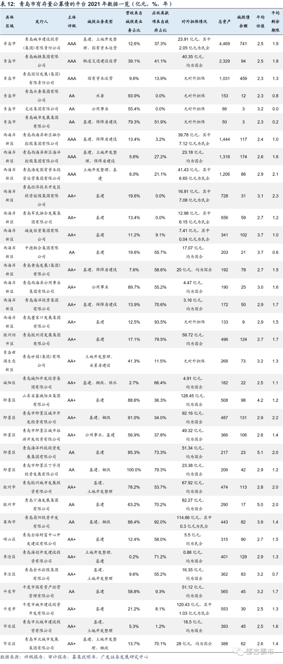 区县级平台方面,即墨区、李沧区、城阳区有5家(含)以上有存量债的区县级平台,其余区县均不超过5家。青岛市发债区县财力普遍较强,2021年一般公共预算收入均在60亿元以上。其中,平度市国有资产经营管理有限公司(“平度国资”)、青岛融汇财富投资控股集团有限公司(“青岛融汇”)、平度市城市建设投资开发有限公司(“平度城投”)和山东省鑫诚恒业集团有限公司(“山东鑫诚”)资产规模在500亿元以上。平度国资主要负责平度市农业和水利等基础设施建设,代建业务是公司主要的收入来源,2021年确认代建收入13.14亿元,占营业收入的58.8%。2021年平度市国有资产管理中心将平度城建所持有的平度市城市更新建设发展有限公司100%的股权无偿划转至平度国资。公司债务结构较不合理,截至2021年末,公司有息债务中非标和债券分别占19.5%、54.4%,均偏高。公司存量债券平均估值为3.2%,其中私募债“20青平02”行权剩余期限为1.3年,行权估值为3.4%,具有一定性价比。山东鑫诚主要负责即墨经开区核心区、青岛汽车产业新城和青岛蓝谷高新技术产业开发区的基础设施建设。2021年公司实现营业收入17.88亿元,其中城投类业务收入占比88.6%,城投属性较强。公司债务负担较重且债务结构较不合理,截至2021年末,公司资产负债率达74.3%,且非标债务占比偏高,2021年占有息债务的比重为23.2%。公司受限资产占比较高,占净资产的比重为82.5%。不过,公司行权剩余期限0.6-0.7年的私募债,行权估值在3.8%-3.9%,具有一定性价比。![]()