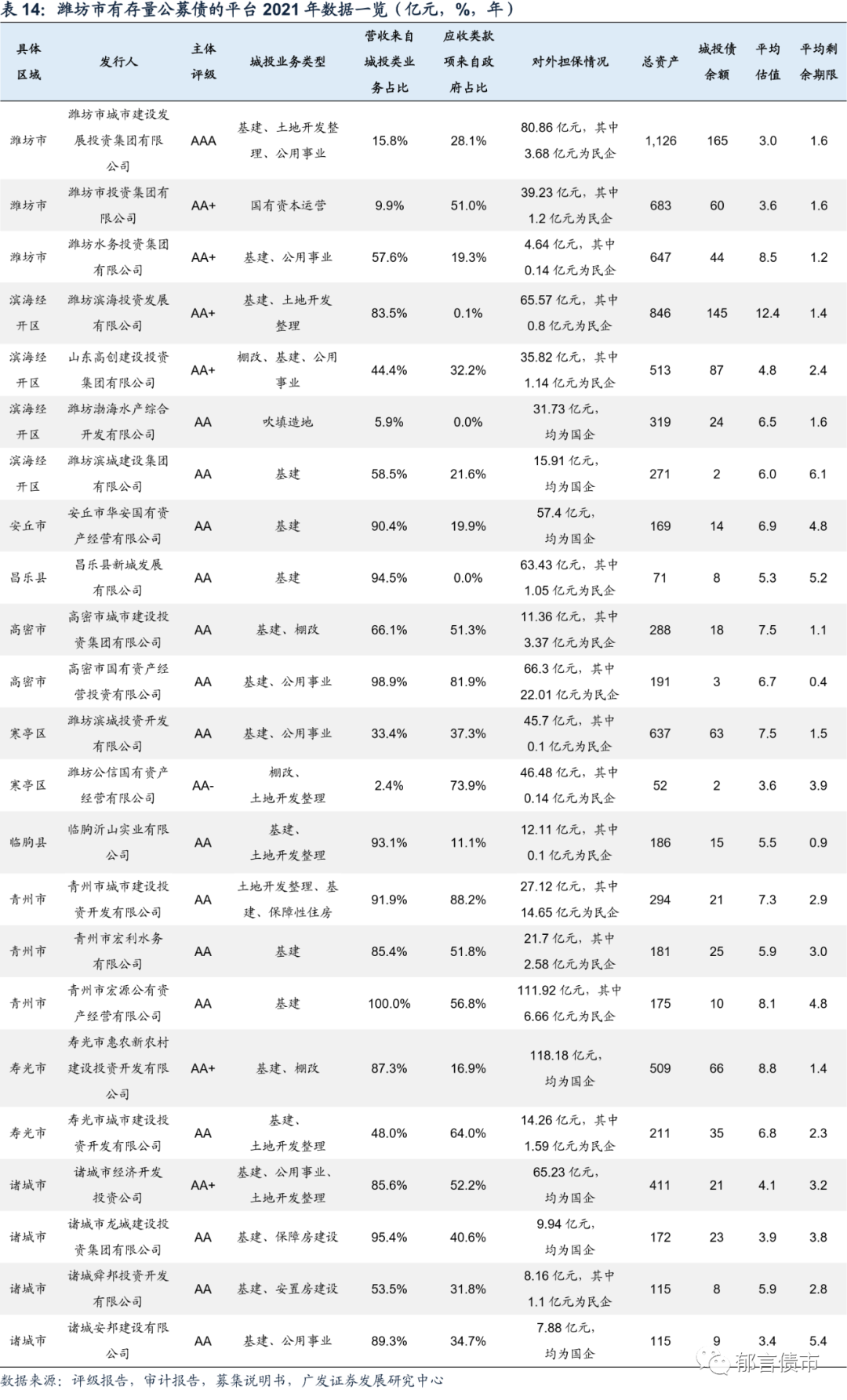 区县级平台方面,高密市、寒亭区等11个区县有发债平台,其中诸城市有6家,高密市和寿光市分别有5家和4家,安丘市、寒亭区、潍城区、青州市各有3家。2021年,寿光市、诸城市、高密市和青州市一般公共预算收入超50亿元,剩余发债区县一般公共预算收入以30亿元以下为主,平均估值普遍较高,超过5%。寿光惠农是寿光市重要的基础设施与棚户区改造建设投资主体,公司城投属性较强,收入主要来自基础设施代建及棚改代建等城投类业务,2021年收入占比达到87.3%。公司债务结构较差,截至2021年末,公司有息债务中非标债务占比35%,处于偏高水平。并且短期债务占比较高,为54.2%。截至2021年末,公司对外担保余额118.18亿元,占当期末净资产比重为58.85%,担保对象均为当地国有企业。诸城经开主要负责诸城市基础设施建设、土地转让、供水以及旅游资源开发建设业务,2021年实现营业收入30.86亿元,其中基础设施建设和水务业务收入分别占比68.7%、25.0%。截至2021年末,公司有息债务中非标债务占比高,达42.8%,并且短期债务占比超过40%。青州城投主要负责青州市土地整理、基础设施建设,此外还开展砂石销售业务。2021年,公司实现营业收入18.0亿元,其中城投类业务收入占比91.9%,且当年公司应收类款项来自政府占比达到88.2%,城投属性较强。不过公司对民企担保规模较大,截至2021年末,公司对外担保余额为27.12亿元,其中14.65亿元为民企,且部分民企已出现逾期、关注类贷款或被列为被执行人。![]()