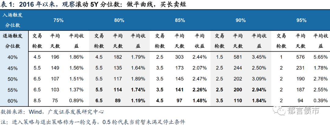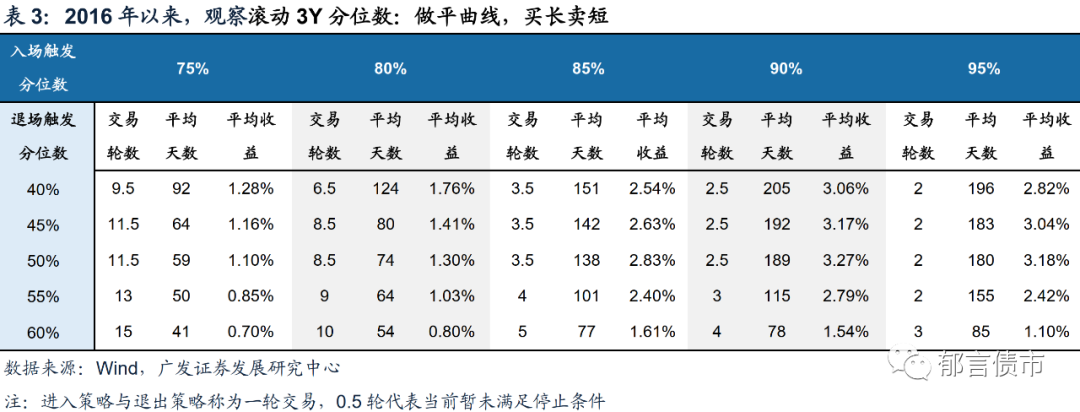 值得留意的是,在做陡曲线时,显然期限利差由5%的低分位水平上行至45%中枢水平的过程,相较于由20%分位走阔至45%分位数的过程难度更大,但考虑到两种情形下触发交易的轮次一样(均为两次),后者的平均收益反而比前者会更高一些。