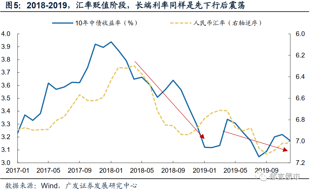实际从历史上看,人民币汇率阶段贬值期间,利率往往趋于下行。回顾811汇改以来的两轮汇率调整中的利率表现。2015-2016年,经历的是汇改-外资流出-汇率贬值过程;而2018-2019年,是中美利差缩窄-汇率阶段贬值-外资短暂流出。这两个汇率阶段贬值的过程中,长端利率是下行或者震荡的状态,主要因为汇率贬值往往对应着国内经济增速放缓、货币政策偏宽松的阶段(详见《汇率贬值下的利率往事》)。