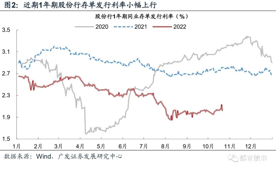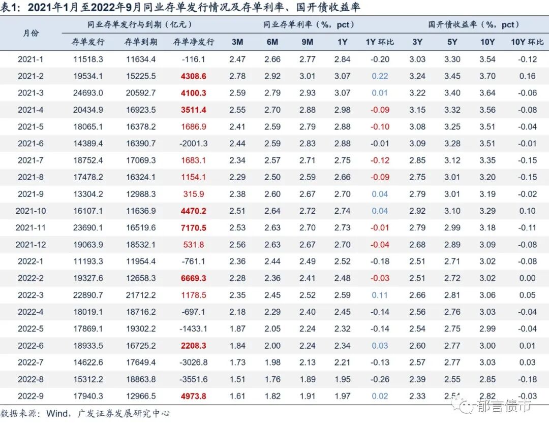 通过回溯同业存单净发行与利率的关系,我们还观察到以下三点:一是同业存单净发行放量,未必伴随同业存单利率上行。观察2021年1月至2022年9月,各月同业存单净发行量为正的月份,共计14个月,其中同业存单利率较前月上行的月份有7个,下行的月份同样有7个。