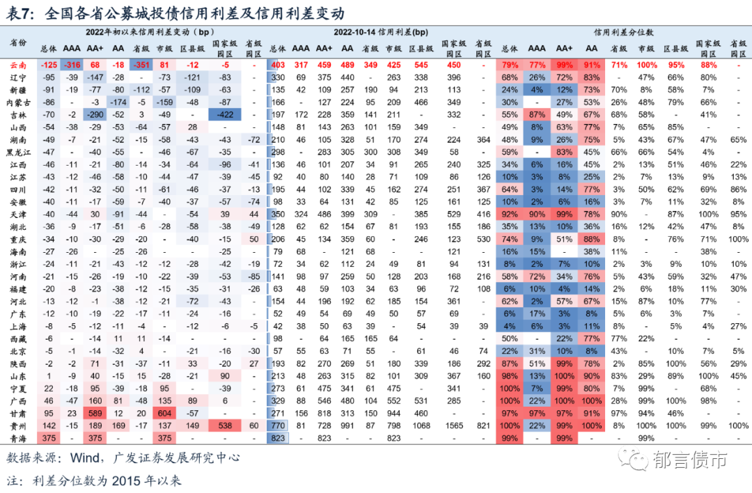 此外,云南省公募城投债利差10月进一步大幅收窄,主要与云南康旅存续债券于2022年10月13日完成提前兑付,不再纳入样本券有关。2022年9月21日云南康旅及子公司债券持有人会议通过提前兑付存续债券的议案,并于10月13日完成提前兑付。2022年10月14日相较于9月末,云南省城投债整体利差进一步收窄53bp,尤其省级城投债利差大幅收窄116bp,主要由于利差较高的云南康旅债券不在样本中。