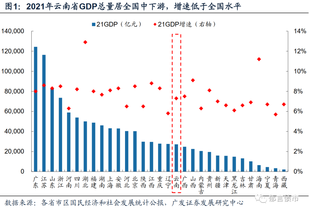 云南省经济实力较弱,2021年GDP增速低于全国水平。云南省2021年GDP为27147亿元,全国排名第18位;GDP增速为7.3%,低于全国水平;人均GDP为57686元/人,全国排名第23位。