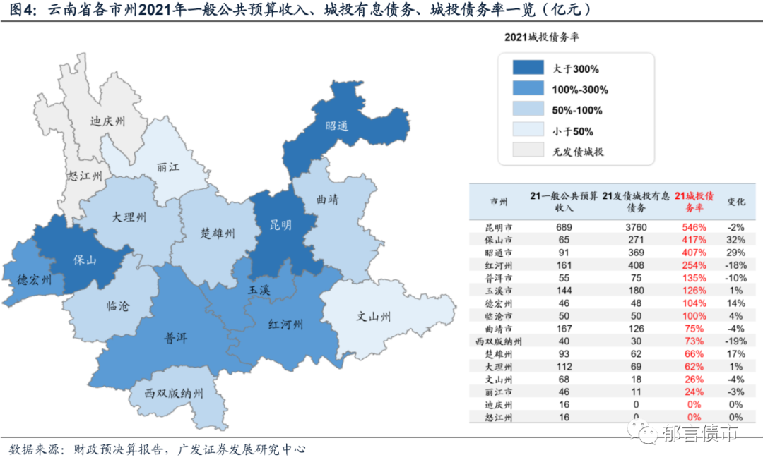 云南省债务负担偏重,2021年城投债务率(发债城投有息债务/一般公共预算收入,下同)和政府债务率(地方政府债务余额/一般公共预算收入)分别为693%和481%,从高到低分别排全国第5位和第6位。