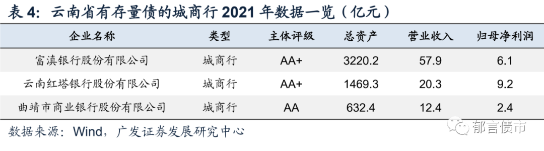 截至2022年10月14日,云南省仅3家城商行有存量债,分别为富滇银行、红塔银行和曲靖市商业银行。截至2021年末,这3家银行总资产合计5322亿元。2007年12月,富滇银行在原昆明市商业银行基础上重组成立,是云南省唯一的省属城商行,与老挝外贸大众银行合资设立老中银行,是全国第一家在境外设立合资银行的城商行。