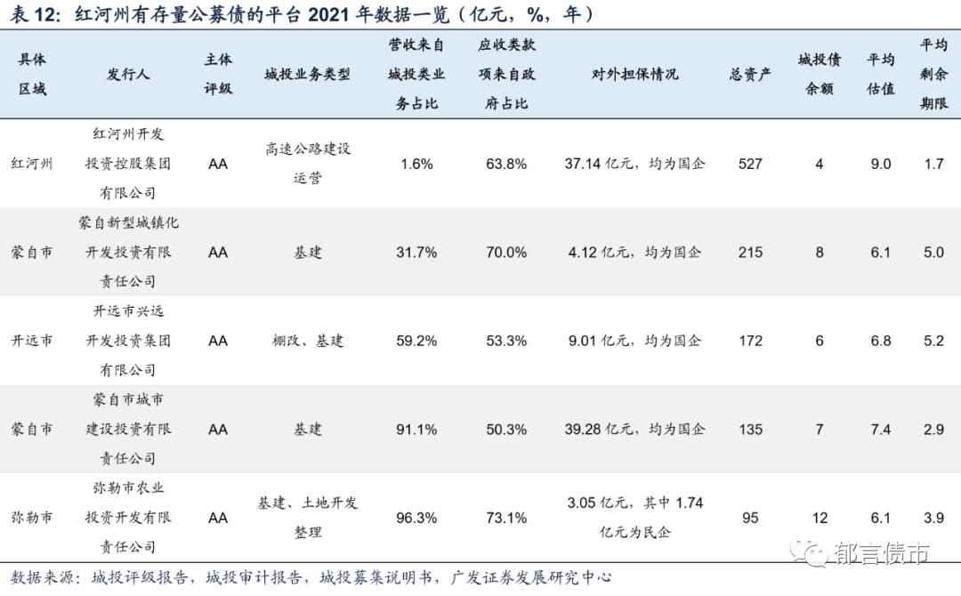 玉溪开投是玉溪市资产规模最大的主平台,负责玉溪市基础设施建设,还有粮油销售、建材销售等业务。2021年公司实现营收23.6亿元,其中粮油销售占比53%,工程及管理费占比26%。公司目前仅存续一只私募债,行权剩余期限为1.7年,行权估值为6.8%。