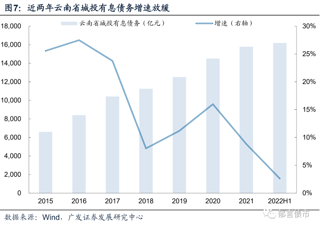 2015-2020年当中,除2018年外,云南省城投有息债务保持10%以上的高速增长,2021年增速降至8.8%。2022上年半云南城投有息债务相较2021年末仅增加412.7亿元,增速进一步降至2.6%。