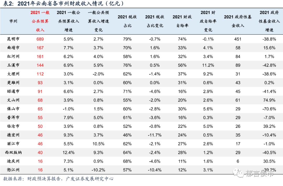 位列GDP第三梯队的昭通市、文山州、保山市、普洱市一般公共预算收入介于50-95亿元。其中2021年普洱市一般公共预算收入增速相较2020年上升5个百分点至7.9%,增速位列全省第三名。文山州政府性基金收入增速为74.9%,改善明显。保山市一般公共预算收入增速为负,并且2020年增速也为负。收入质量方面,昭通市税收收入占比较高,为71%,居全省第三位。债务负担方面,2021年保山市和昭通市城投债务率分别为417%和407%,从高到低分别排全省第二和第三位,而文山州城投债务率仅为26%,债务负担较小。