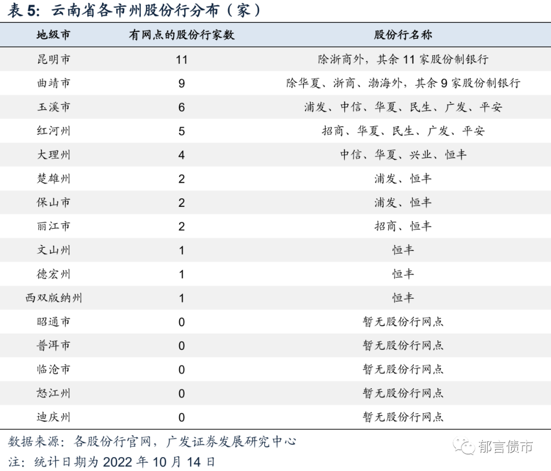 股份行资源方面,昆明市和曲靖市有网点的股份行数量相对较多,其余大部分市州有网点的股份行数量不超过2家。其中昆明市有11家股份行设立网点,仅浙商银行暂未设立网点。曲靖市、玉溪市、红河州和大理州设有网点的股份行数在4-9家,其余市州有网点的股份行数量不超过2家。