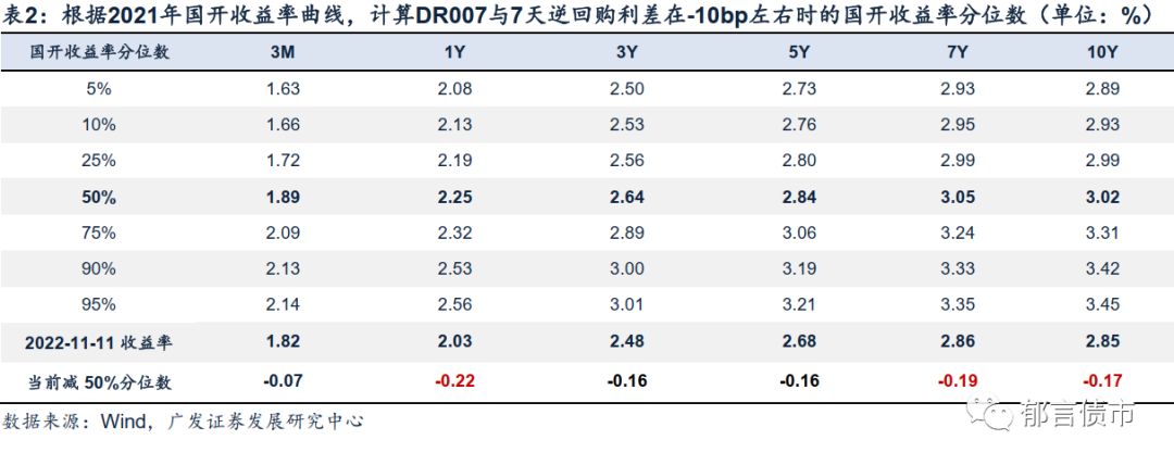 考虑到经济增长仍低于潜在增速,货币政策尚未走向收紧,我们以2021年的债市环境作为参考。假设未来一段时间,DR007维持在1.9%的偏高位置,较7天逆回购利率低10bp,参考2021年DR007较7天逆回购利率的利差在[-15,-5]bp时,国债、国开债和同业存单收益率曲线,各分位数可作为当前参考。