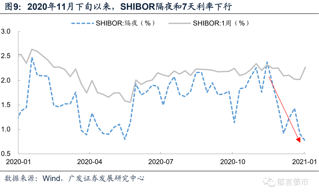 11月30日,央行意外投放2000亿元MLF,流动性明显转松。12月15日央行投放9500亿元MLF,创单次投放记录,扣除当月6000亿元MLF到期,净投放3500亿元。2020年12月最后一周,SHIBOR隔夜周度均值下行15bp至0.76%,连续七周均值位于2%以下;SHIBOR 7天也围绕2.2%附近波动。