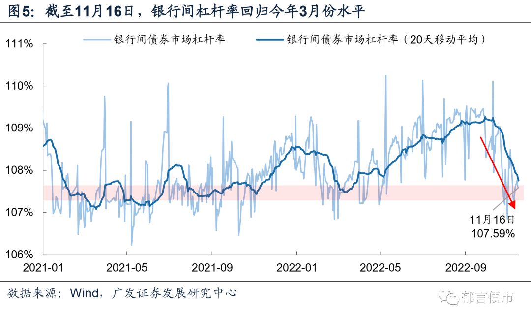 当前债市调整幅度远大于过去两轮,利率水平已经达到815降息以来的最高水平。假设未来一段时间,DR007维持在1.9%的偏高位置,较7天逆回购利率低10bp,参考2019和2021年DR007较7天逆回购利率的利差在[-20,-0]bp时,1到10年国债,5年以内国开债,与历史收益率曲线相比,也已处于相对高位。银行间杠杆率也随之下降,目前已由9月109%的高杠杆逐渐回归至107.5%,与今年3月的杠杆水平相当。与此同时,中长期纯债基金久期中位数从11月9日2.40年回落至16日1.86年的低位。