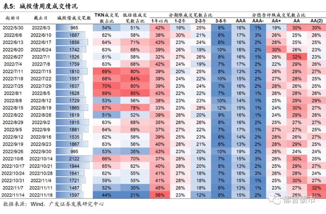 城投债由于流动性相对较弱,面临抛售对手方较少的压力。上周城投债成交笔数并未明显放量,但高估值成交占比为79%,环比继续上升且创下年内新高。从结构看,1年以内成交占比大幅上升,江浙城投占比39%(年内高位),一定程度反映了中长久期、非核心区域城投难以抛售。