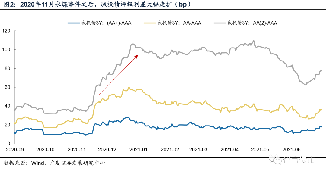 永煤事件之后,信用债走势呈现以下三点变化。一是信用债收益率高点晚于利率债2-3个交易日,但信用利差继续走扩。2020年11月10日永煤事件之后,利率债持续调整了7个交易日,收益率在2020年11月19日左右到达高点,信用债是在11月24日左右到达高点。此后,信用债收益率下行幅度小于利率债,信用利差继续走扩,信用利差的高点出现在2020年12月31日。