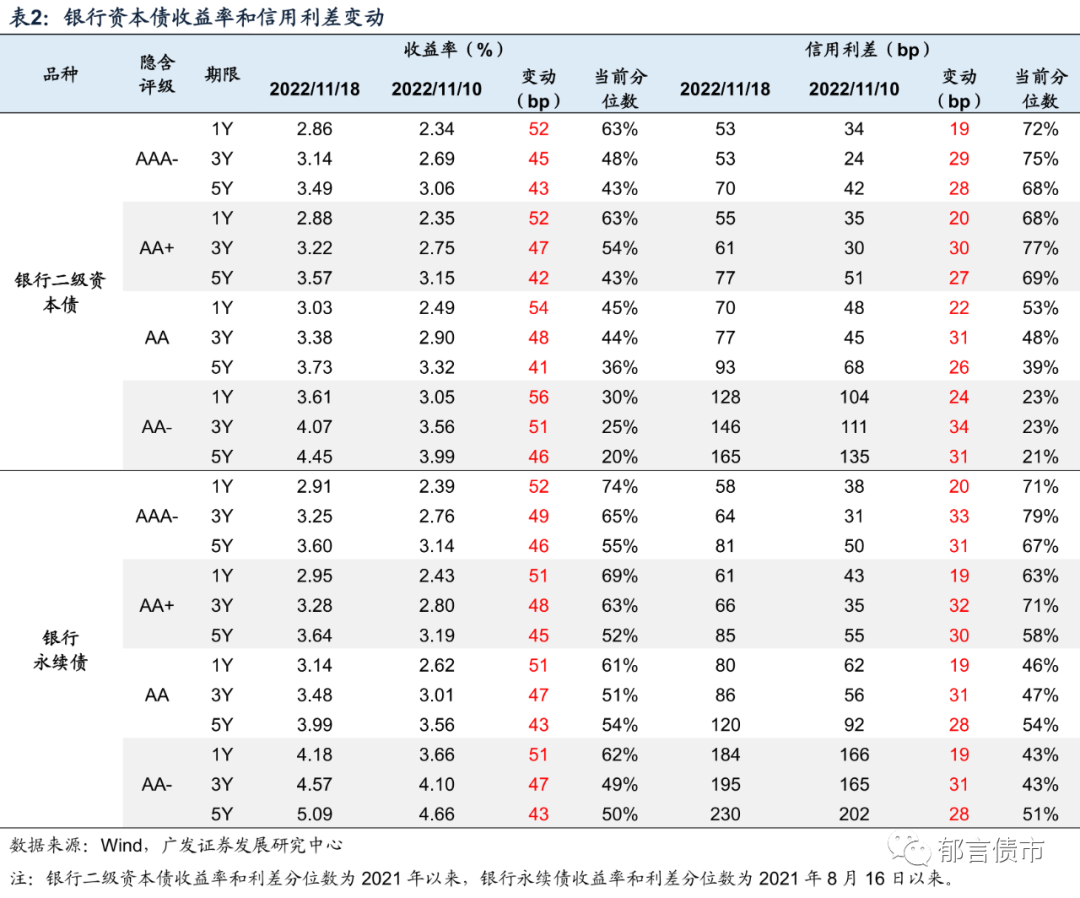 信用债收益率同步大幅上行,信用利差走扩。11月18日较10日,中低评级城投债收益率上行幅度较大,其中AA、AA(2) 1Y收益率分别上行了67bp、74bp,信用利差走扩34-41bp;AA(2) 3Y收益率上行56bp,信用利差走扩39bp。银行二级资本债各评级1Y收益率上行52-56bp,信用利差走扩19-24bp;3Y和5Y收益率上行41-51bp,信用利差走扩26-34bp。