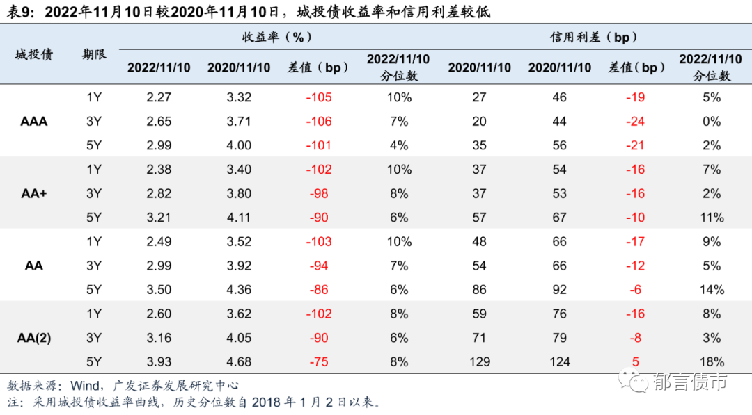 2022年12月31日较11月10日,城投债AAA 1Y和3Y信用利差走扩14-19bp,AA+ 1Y和3Y信用利差走扩26-27bp,AA 1Y和3Y信用利差走扩47-50bp,AA(2) 1Y和3Y信用利差大幅走扩82bp。