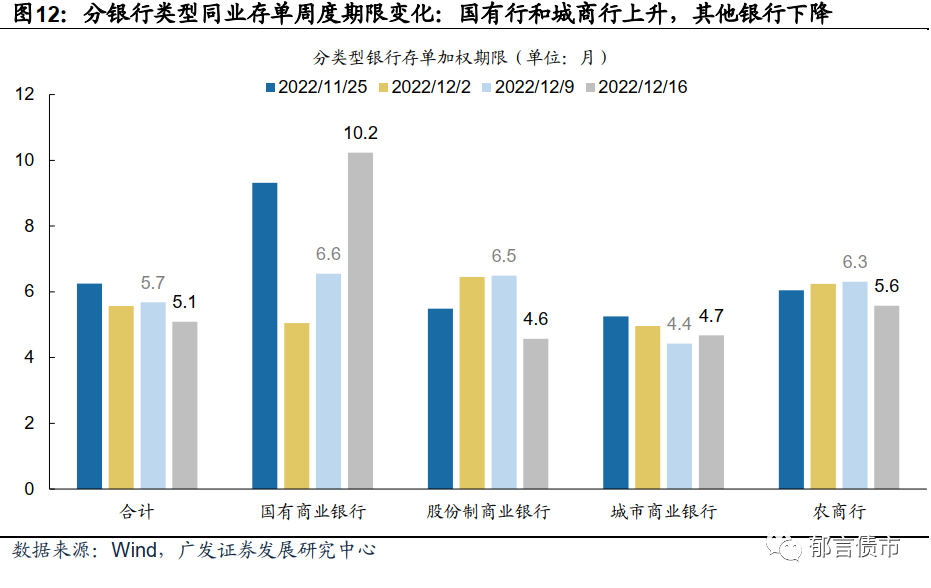 存单加权发行利率为2.66%,加权期限缩短。12月12-16日,同业存单加权发行利率2.66%,较前一周上行23bp。存单加权发行期限缩短至5.1个月,前一周为5.7个月。1年期存单占分类型银行存单总发行量比例,合计17.4%(相对前一周+0.4pct),其中,国有行65.8%(+49.2pct),股份行5.0%(-15.8pct),城商行18.1%(+1.3pct),农商行8.4%(-2.6pct)。