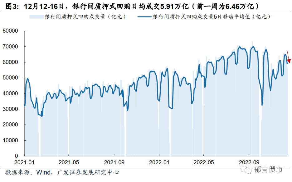 银行间质押式回购成交量回落。12月12-16日,银行间质押式回购成交量平均值为5.91万亿元,较前一周的6.46万亿元回落,周内成交量持续下行,周一为6.31万亿元,周二至周五持续下降,周五为5.60万亿元。隔夜成交量也有所回落,周一至周五成交量在4.80-5.54万亿元之间,当周的平均值为5.09万亿元(前一周为5.71万亿元)。