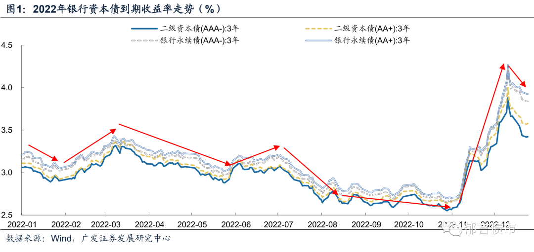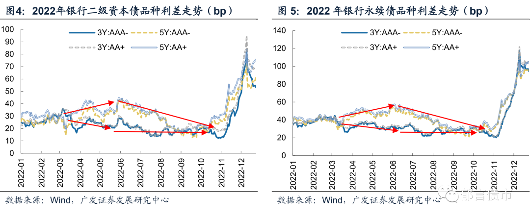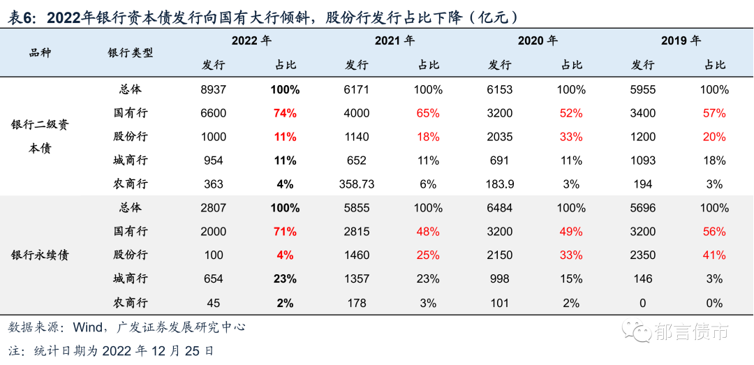 从发行结构上来看,2022银行资本债发行明显向国有大行倾斜,股份行发行占比下降。2022年国有大行二级资本债发行6600亿元,占比达74%,而往年这一占比均在65%以下;国有大行永续债发行2000亿元,占比为71%,相较往年也明显提升。而股份行银行资本债发行规模下降较多,发行占比相较往年均有所下降,其中2022年股份行永续债发行仅100亿元,占比下降至4%。