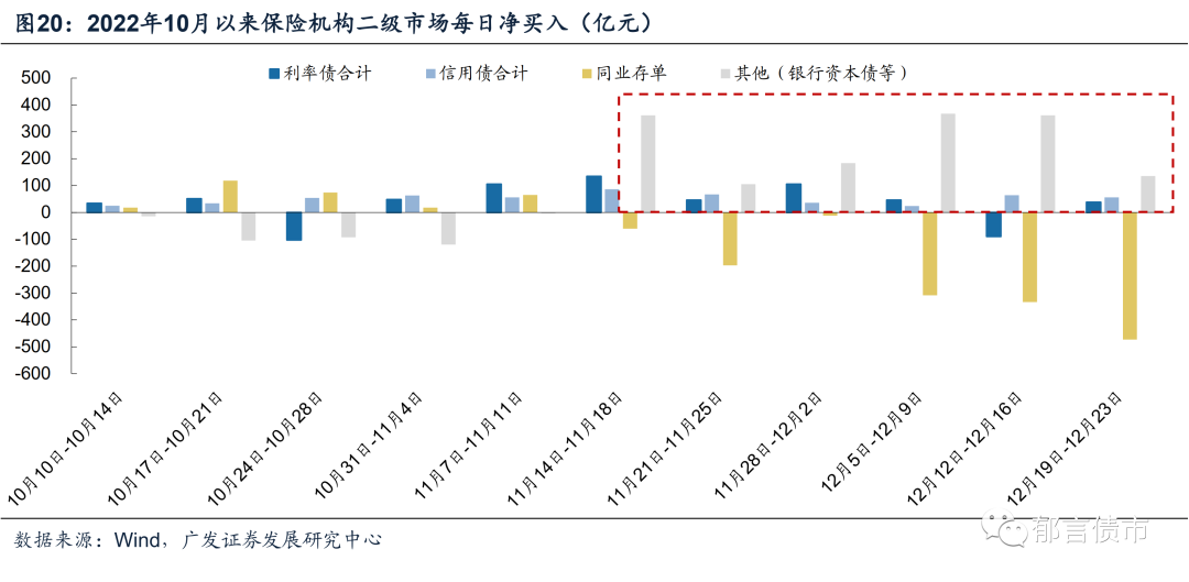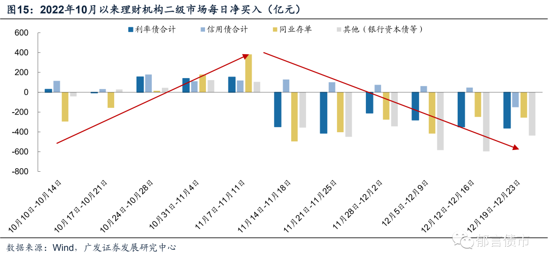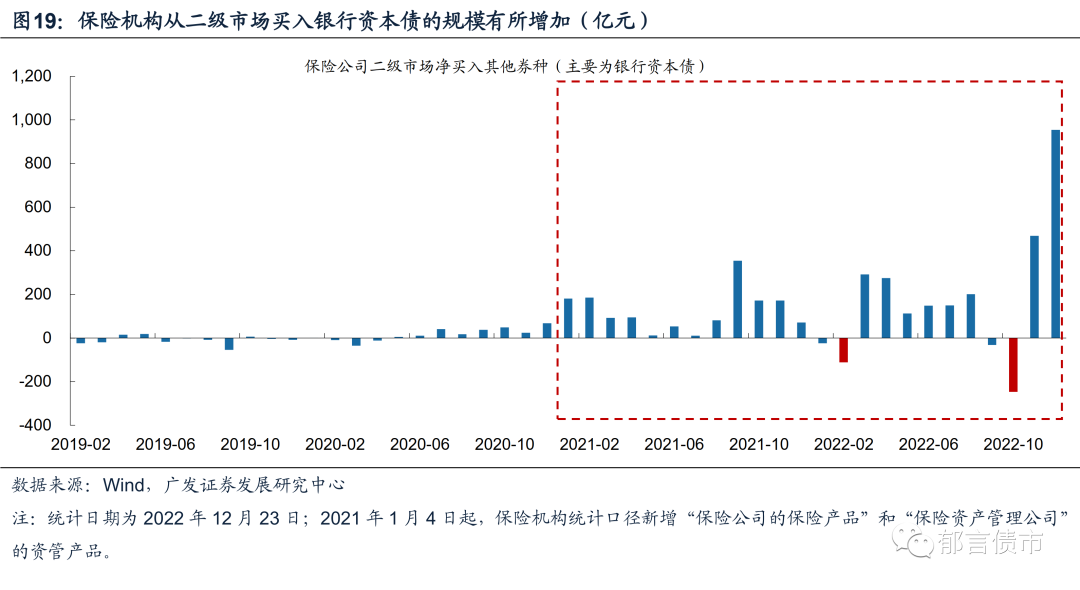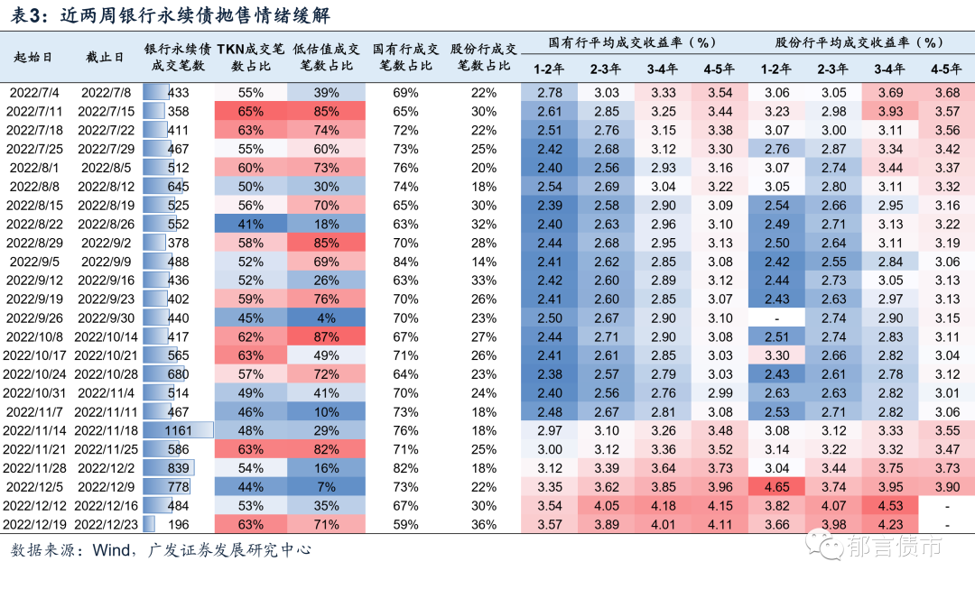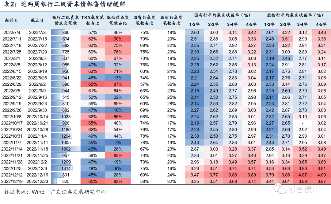 近两周银行资本债成交已经明显缩量,并且低估值成交占比回升,理财和基金的抛售情绪缓解。2022年12月12-23日,银行二级资本债和银行永续债成交笔数较之前有所下降,并且低估值成交笔数也明显上升。尤其是2022年12月19-23日,银行二级资本债和银行永续债仅成交325、196笔,低估值成交占比上升至70%以上,或指向抛售情绪缓解。