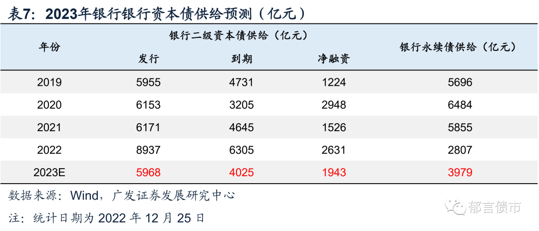 我们依然从资本充足率的角度预测2023年银行资本债的供给水平。首先,由于商业银行2019-2021年12月末较9月末风险加权资产总额(RWA)增速及资本净额增速均较稳定,因此我们根据其平均增速计算得到2022年末RWA及资本净额。其次,我们假设:(1)2023年末商业银行资本充足率维持2022Q3水平;(2)基于近几年银行RWA增速持续下滑,假设2023年RWA增速为2019-2021年平均增长率减去1个百分点;(3)留存净利润是商业银行唯一的内源资本补充渠道,由于近几年银行派息率多为30%,因此假设净利润留存比例为70%;(4)净利润增速为近3年平均增长率;(5)基于近3年银行资本债、优先股和可转债等资本补充外源渠道中银行资本债占比约为90%,因此假设外源资本补充工具中银行资本债占比为90%。