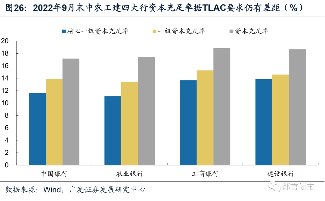 其中,TLAC监管下的实际资本充足率=TLAC风险加权比率(16%)+储备资本(2.5%)+逆周期资本(0-2.5%)+G-SIBs附加资本(1%-1.5%)-存款保险基金抵扣(0-2.5%)。逆周期资本和存款保险基金抵扣均按0计算,G-SIBs附加资本与国内系统重要性银行附加资本不重复计算,四家大行TLAC监管下的实际资本充足率最低需达到19.5%(农行)或20%(中行、工行、建行)。