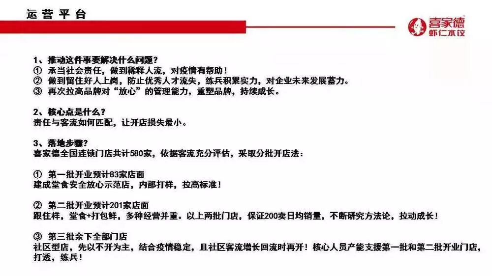 但是,为了企业长远发展,要设法分批恢复门店营业,避免优秀员工流失。在喜家德的分批开店计划中,共分了三批: