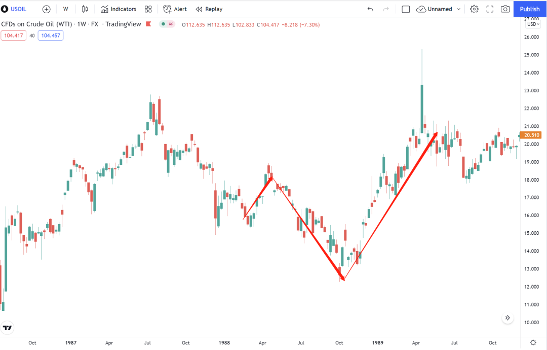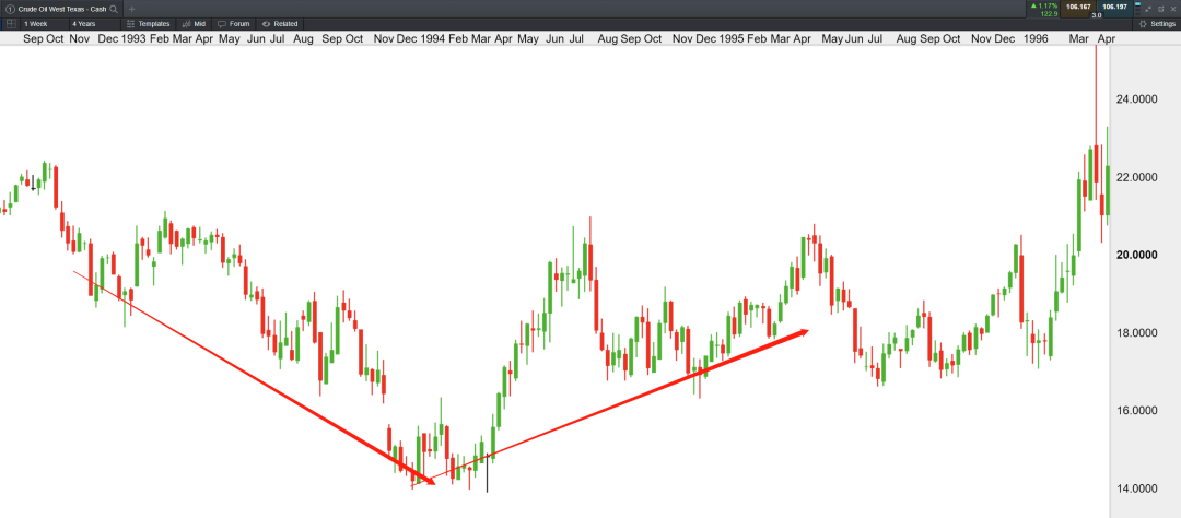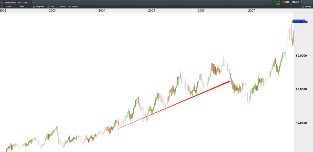 从通胀背景上看,当前的美国通胀与1980年代相似,1970年代中东战争造成了前所未有的原油供应担忧,而美国因越南战争大量超发货币维持军费开支。这与当前的美国内部环境一样,即疫情期间大量引发货币,俄乌战争引发原油供应担忧。价格表现规律上也有相似现象,油价自2020年4月触底后一路反弹,走出了长达两年的牛市行情。而1980年代,油价也在加息周期前持续走高,随后连续走低。