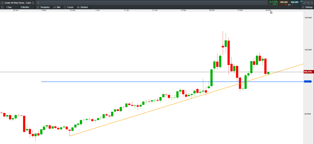 供应的担忧情绪在周一实现了一定程度的缓和,这是由于俄乌双方谈判传达出停火的意愿,以及美国方面与其他同盟国商讨进一步释放原油战略储备,油价出现了单日暴跌逾8%的表现。美国原油当前在104附近获得支撑(3月29日)。
