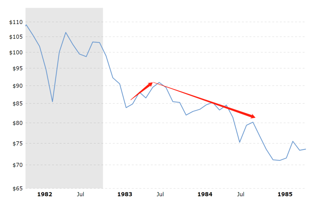 以美国WTI原油为例,从以下多图可看出,除1983 – 1984的加息周期以外,其他五次加息周期油价基本呈现震荡上行的趋势。