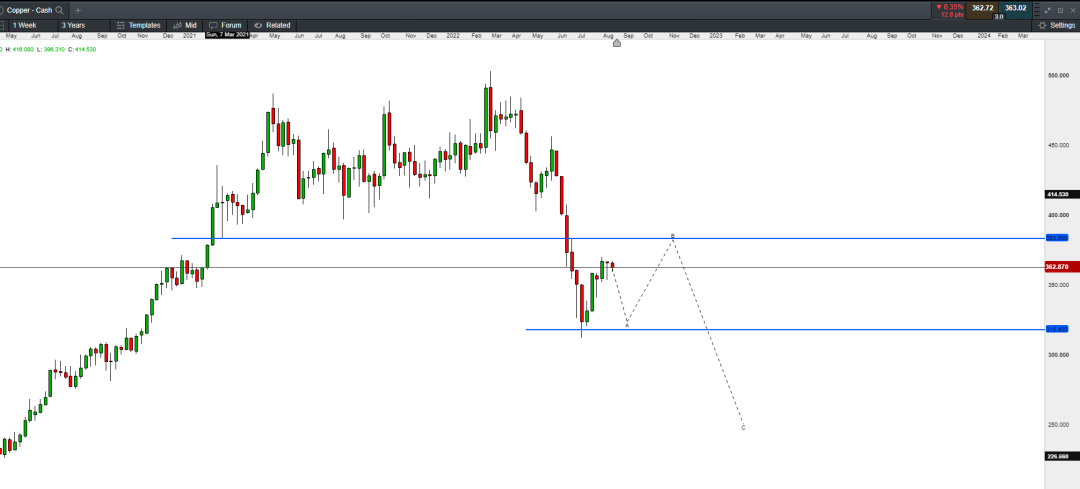 近几个月来,由于全球央行进入加速紧缩周期,制造业明显放缓,并且新冠肺炎病毒的封锁导致金属消费大国中国的制造业放缓,削弱了对电力和建筑行业广泛使用的金属的需求。铜价在4月下旬进入到了下行周期,并在6月、7月经历了大幅下跌。