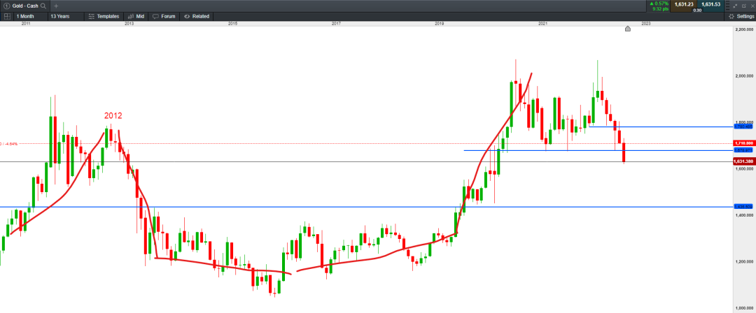 如果从月线来看,黄金当前与2012-2013年的结构有相似之处,