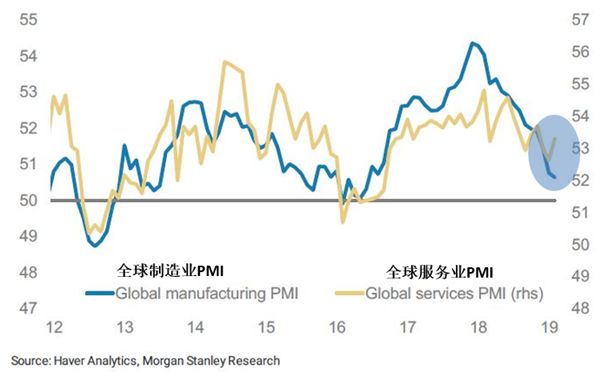 如果要给美国经济前景预警的话,通过全球制造业PMI与服务业PMI的比较,可以发现全球制造业出现了严重的疲软迹象。
