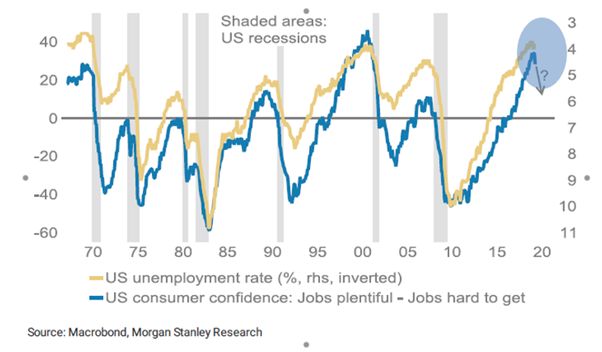 回到美国本土上,大摩的劳动力市场模型中给出了美国劳动力市场可能见顶的信号,“就业难”和“难就业”之间的间隔已经收窄到“充足”水平,和此前2000年周期非常相似。