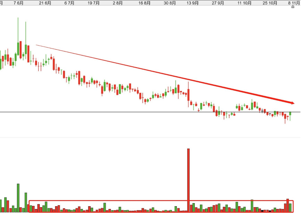 在股价出现在下跌趋势中,成交量持续萎靡,意味着市场中的买家较少,股票关注度低,意味着价格仍将继续下跌,这就是我们常说的股票天天阴跌。往往最可怕的不是放量下跌,而是迟迟看不见希望的阴跌。