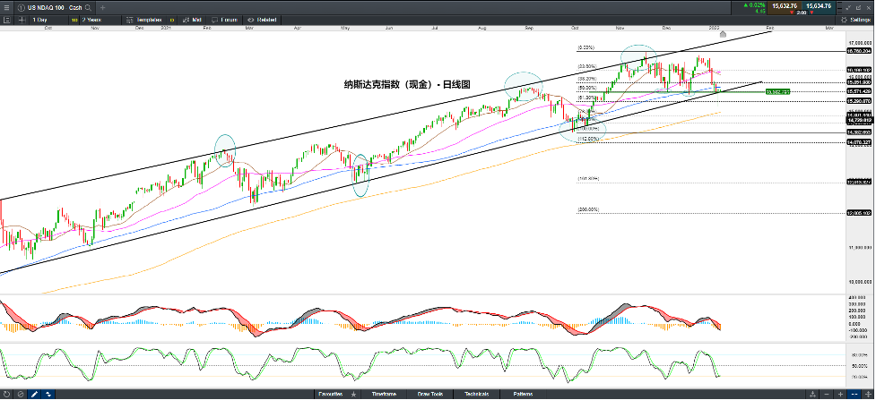 纳斯达克指数在长期的上行趋势线出现技术反弹,日线图的下引线较长,表明多头力量显现攻势,日内的潜在的反弹目标在15,850点附近,然后是16,000整数关口。下方支持主要看200日均线附近15,000关口附近。