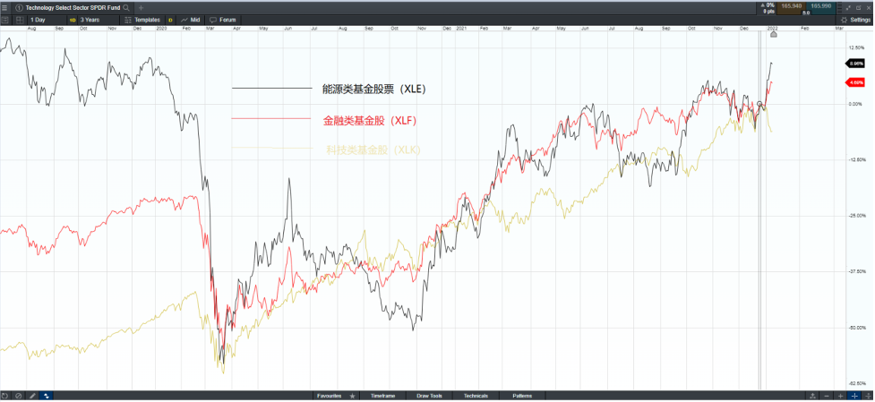根据美国12月份的非农业就业数据看,美国失业率下降至3.9%,基本接近2020年疫情前的水平,在经济强势复苏的环境下,货币收紧周期中,价值型股票将成为更具有优势的板块,这里主要指的是银行与能源。相比之下,科技类的成长型股票将由于高收益率而影响到其股值,难以保持近两年的高速增长。金融类基金股票(XLF)在12月末以来持续上扬,再次创出历史新高。同时,能源类基金指数(XLE)也反弹回至2020年1月份高位。相反,科技类基金股票(XLK)1月份的跌幅达6%。